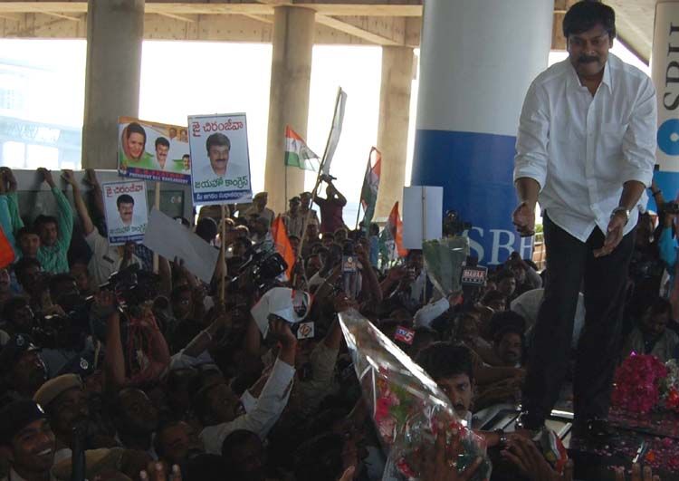 PRP president K Chiranjeevi arrives at Shamshabad airport to a rousing reception by Congress and PRP workers in Hyderabad on Tuesday. INN Photos