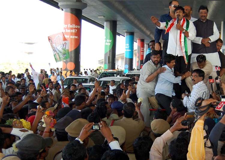 PRP president K Chiranjeevi arrives at Shamshabad airport to a rousing reception by Congress and PRP workers in Hyderabad on Tuesday. INN Photos