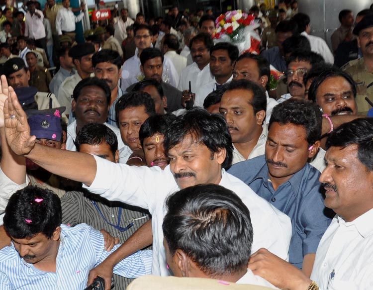PRP president K Chiranjeevi arrives at Shamshabad airport to a rousing reception by Congress and PRP workers in Hyderabad on Tuesday. INN Photos