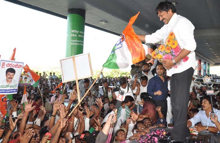 PRP president K Chiranjeevi arrives at Shamshabad airport to a rousing reception by Congress and PRP workers in Hyderabad on Tuesday. INN Photos