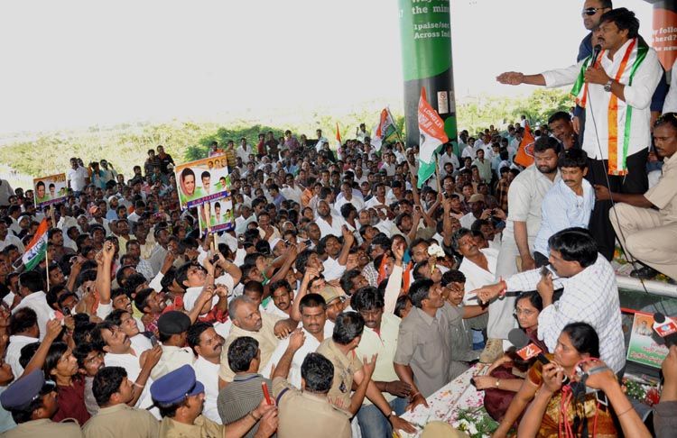 PRP president K Chiranjeevi arrives at Shamshabad airport to a rousing reception by Congress and PRP workers in Hyderabad on Tuesday. INN Photos