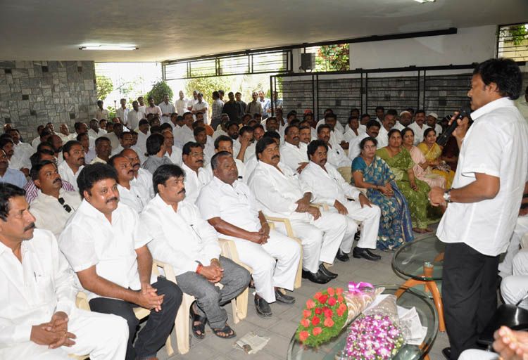Praja Rajyam Party president K Chiranjeevi addressing a meeting of party leaders at his residence in Jubilee Hills on Wednesday. INN Photos