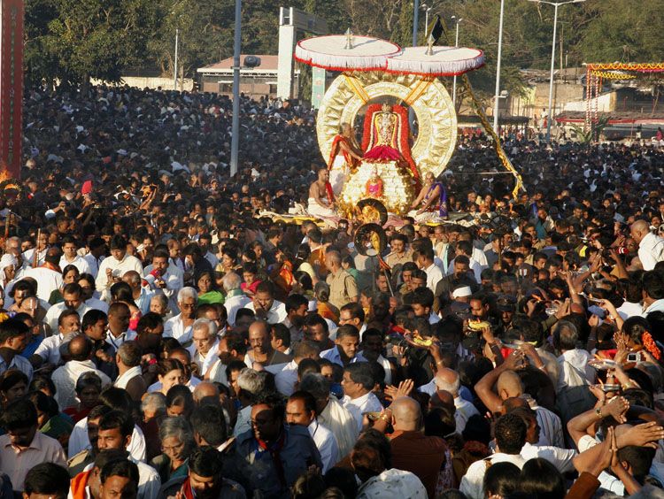 Devotess throng four mada streets at Tirumala to watch and participate in the procession of Lord Malayappaswamy on the eve of Radhasaptami on Thursday.