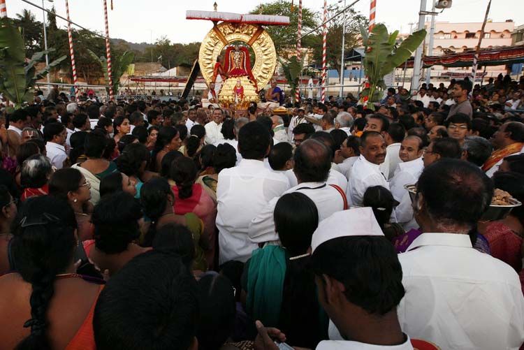 Devotess throng four mada streets at Tirumala to watch and participate in the procession of Lord Malayappaswamy on the eve of Radhasaptami on Thursday.