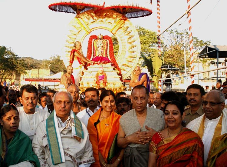 Processional deity of Lord Malayappaswamy taken out in procession around four mada streets at Tirumala from 5.30am to 8.00am in connection with Radhasapthami Festival. The Malayappaswamy waited in south mada street till sun rays fall on him. Governor of AP Narasimhanan along with large number of devotees took part in the festivities.