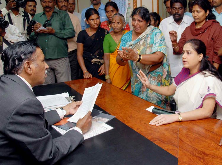 TRS MP Vijayashanti lodges a complaint before the State Human Rights Commission against the brutalities of police who beat up people protesting against a Racha Banda programme at Dubbak in Medak district, in Hyderabad on Thursday. INN Photos