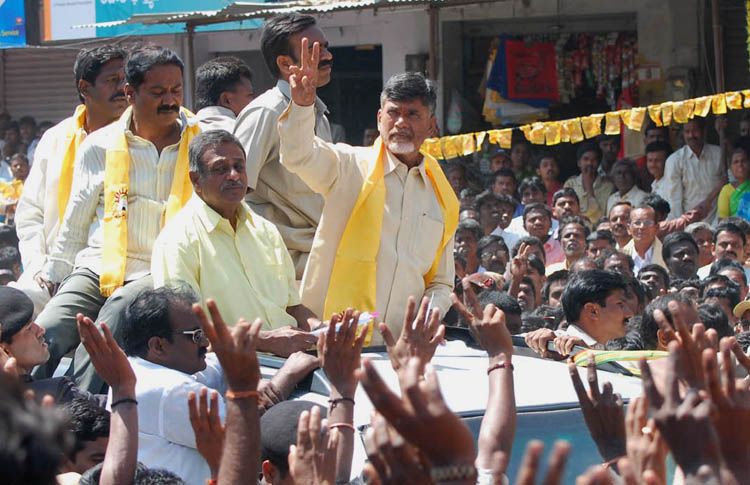 Telugu Desam Party president N Chandrababu Naidu who took part in a dharna demanding the state government to release fee arrears, waving to public in Madanapalli of Chittoor district on Saturday.