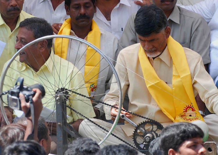 Telugu Desam Party president N Chandrababu Naidu who took part in a dharna to highlight weavers problems trying his hand at charkha wheel in Madanapalli of Chittoor district on Saturday.