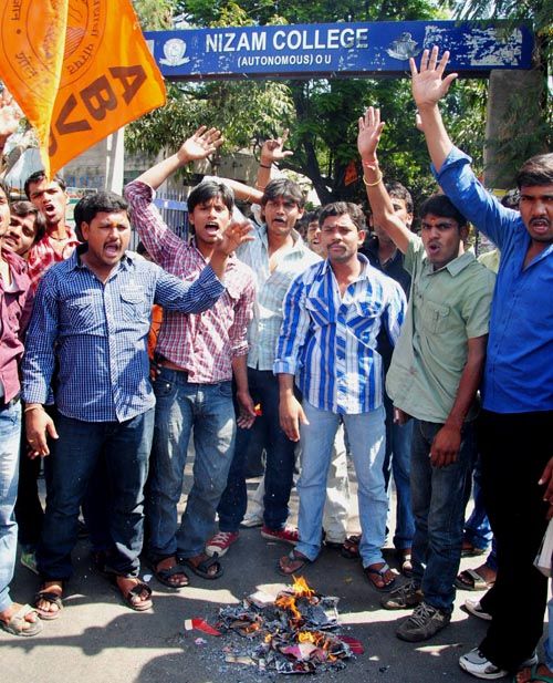 Students belonging to ABVP burning Valentines Day greeting cards in protest against the Valentines Day celebrations in front of the Nizam College in Hyderabad on Monday.