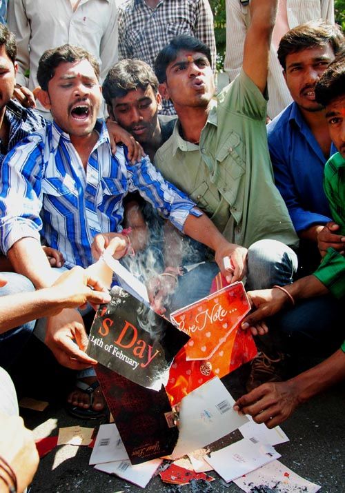 Students belonging to ABVP burning Valentines Day greeting cards in protest against the Valentines Day celebrations in front of the Nizam College in Hyderabad on Monday.