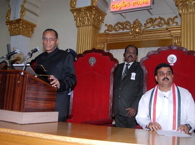 Governor ESL Narasimhan and Assembly deputy speaker Nadendla Manohar looking dazed at the unruly scenes enacted by TRS MLA's in a joint session of Assembly on Thursday.