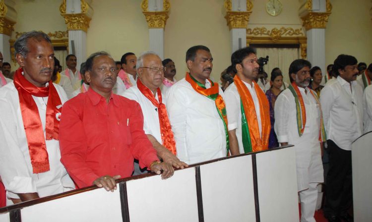 Though, the fisrt day of Assembly budget session begins on a soar note on Thursday, legislators of different parties cheerfully greeted each other before unruly scenes unveiled. Here are some pictures to cheer.