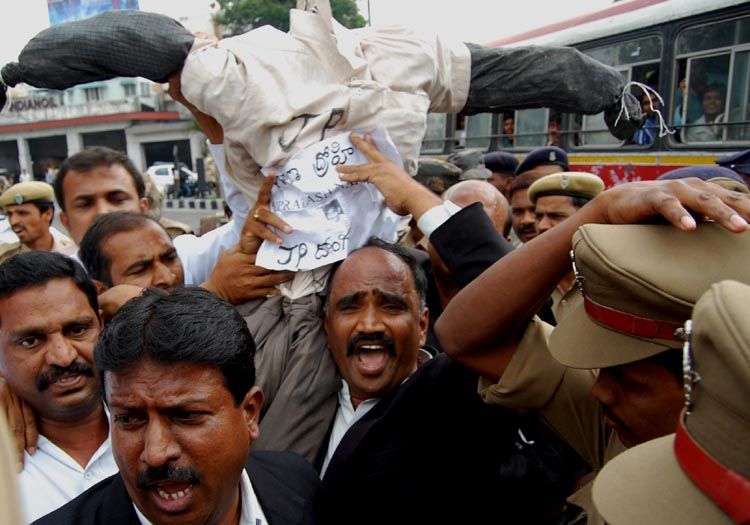 Pro-Telangana Advocates burn an effigy depicting Lok Satta Party president Jayaprakash Narayan, alleging that his comments to impose President’s Rule had hurt the sentiments of Telangana people, in front of the AP State Museum, State Assembly in Hyderabad on Friday. INN Photos