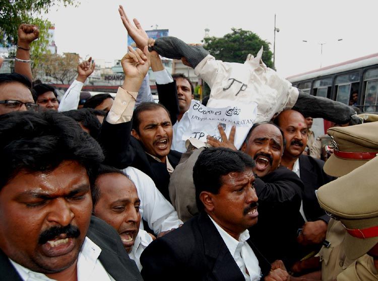 Pro-Telangana Advocates burn an effigy depicting Lok Satta Party president Jayaprakash Narayan, alleging that his comments to impose President’s Rule had hurt the sentiments of Telangana people, in front of the AP State Museum, State Assembly in Hyderabad on Friday. INN Photos