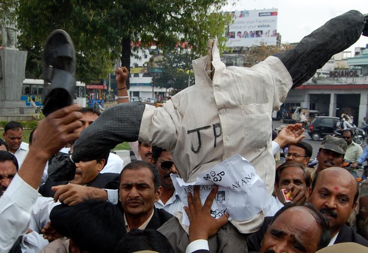 Pro-Telangana Advocates burn an effigy depicting Lok Satta Party president Jayaprakash Narayan, alleging that his comments to impose President’s Rule had hurt the sentiments of Telangana people, in front of the AP State Museum, State Assembly in Hyderabad on Friday. INN Photos