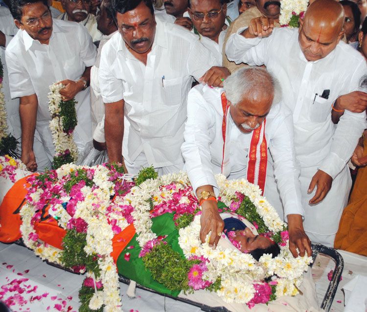 Bharatiya Janata Party leaders Bandaru Dattatreya, Ch Vidyasagar Rao and others pays their respects to the body of Vanam Jhansi Rani who was killed in a road mishap in Mahabubnagar on Saturday. Her body was brought to the BJP headquarters at Nampally to enable party workers pay their respects. INN Photos