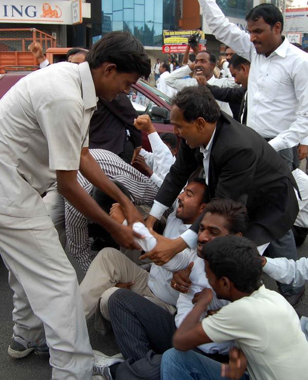 Police arrest protesting lawyers who tried to lay seige to the Raj Bhavan in Hyderabad on Monday. INN Photos