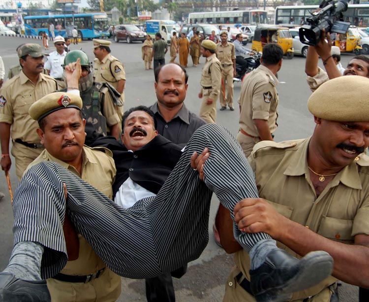 Police arrest protesting lawyers who tried to lay seige to the Raj Bhavan in Hyderabad on Monday. INN Photos