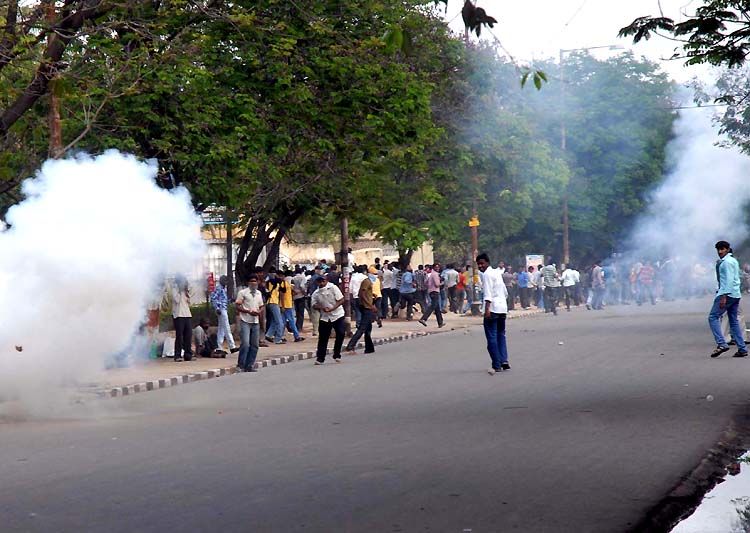 Osmania University students face teargas shells as they protest for separate Telangana state at the university campus in Hyderabad on Monday. INN Photos