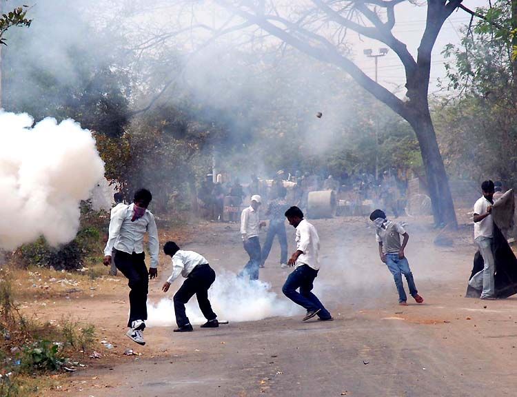 Osmania University students face teargas shells as they protest for separate Telangana state at the university campus in Hyderabad on Monday. INN Photos