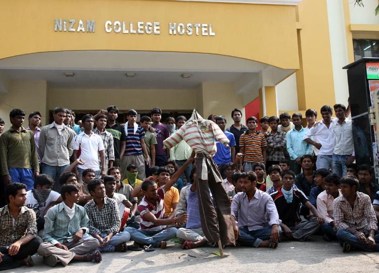 Nizam College Students burn an effigy depicting Chief Minister N Kiran Kumar Reddy during a protest against the government’s reluctance to table a resolution seeking a Bill on separate Telangana in Parliament at Basheer Bagh in Hyderabad on Tuesday. INN Photos