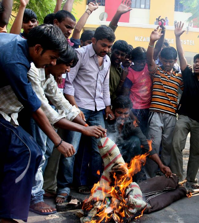 Nizam College Students burn an effigy depicting Chief Minister N Kiran Kumar Reddy during a protest against the government’s reluctance to table a resolution seeking a Bill on separate Telangana in Parliament at Basheer Bagh in Hyderabad on Tuesday. INN Photos