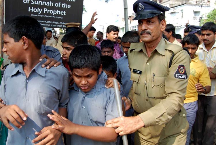 Visually challenged students of a blind school blockade the road at Darusshifa in support of the 48-hour bandh call for a separate Telangana state, in Hyderabad on Tuesday. INN Photos