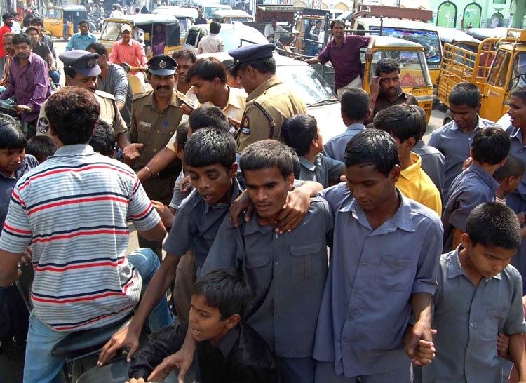 Visually challenged students of a blind school blockade the road at Darusshifa in support of the 48-hour bandh call for a separate Telangana state, in Hyderabad on Tuesday. INN Photos