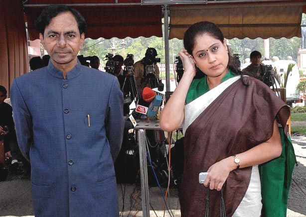 K. Chandrasekhara Rao, president of the Telangana Rashtra Samithi, and party MP Vijayashanthi at the Parliament House, in New Delhi on Tuesday.