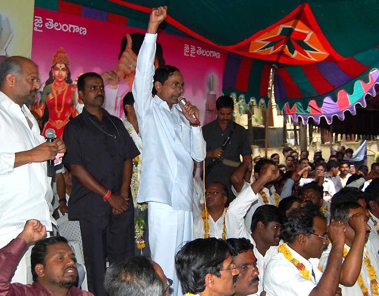 Telangana Rashtra Samithi president K Chandrasekhar Rao addresses the gathering of employees of the Board of Intermediate Education in Hyderabad on Saturday. INN Photos