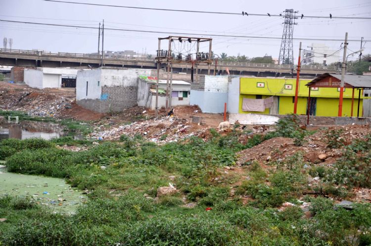 Systematic encroachments on the Musi River at Chaderghat Causeway Bridge in Hyderabad. Land grabbers are dumping debris from dismantled buildings on the river bed and then selling this filled up lands at about Rs 5,000 to Rs 7,000 per square yard. If the blocking of the water flow continues, the house around will be in great danger of being inundated when the river is in spate in monsoon season.