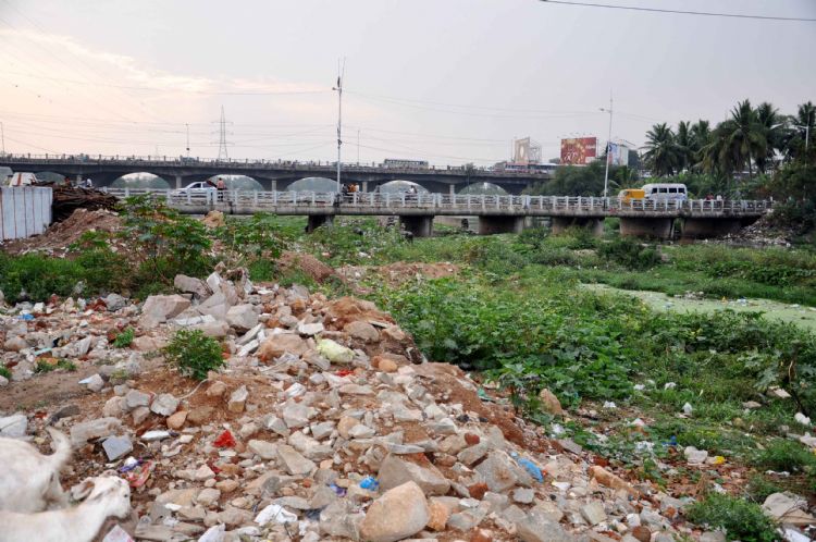Systematic encroachments on the Musi River at Chaderghat Causeway Bridge in Hyderabad. Land grabbers are dumping debris from dismantled buildings on the river bed and then selling this filled up lands at about Rs 5,000 to Rs 7,000 per square yard. If the blocking of the water flow continues, the house around will be in great danger of being inundated when the river is in spate in monsoon season.