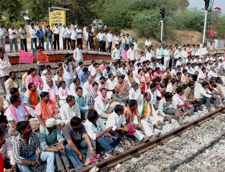 TRS and BJP activists squat on the tracks at Nalgonda railway station on Tuesday as part of rail roko stir. INN Photos