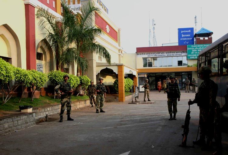 Stalled trains, deserted railway tracks and bored security personnel at the Nampally Railway Station in Hyderabad on Tuesday. INN Photos