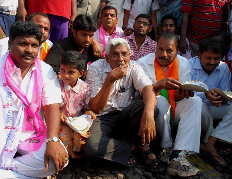 Prof Kodandaram along with BJP leader N.Indrasena Reddy eats on the tracks near the Ghatkeser Railway station during the Rail Roko agitation demanding a Bill on Telangana in Parliament in Secundrabad on Tuesday. INN Photos