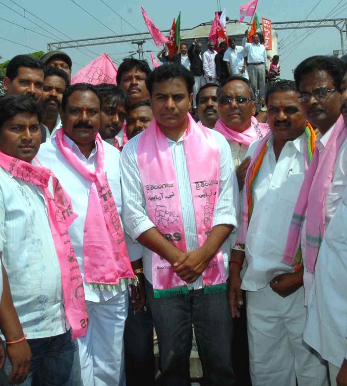 TRS MLA K Taraka Rama Rao joins TRS, BJP activists in rail roko stir at Moula Ali Railway Station in Hyderabad on Tuesday. INN Photos