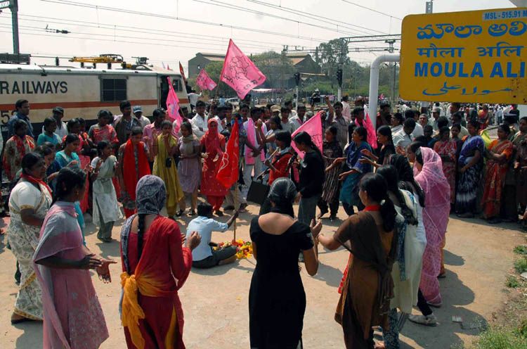 Pro-Telangana activists playing Bathukamma at Moula Ali railway station platform during their demonstration demanding a separate state. Rail transport was paralysed in Hyderabad and nine other districts of Andhra. INN Photos