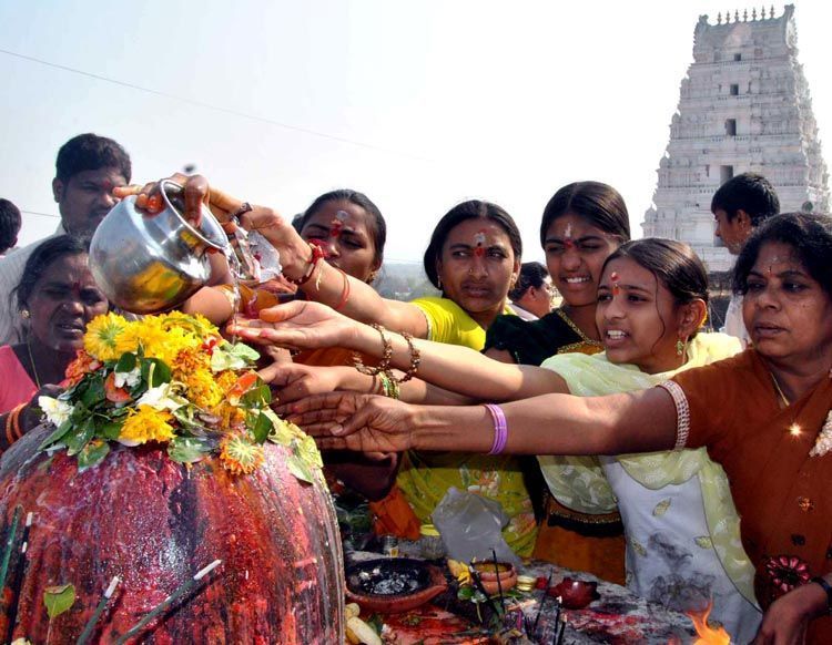 Devotees perform puja at the Shivalingam at Sri Ramalingeswara Swamy temple on the occasion of Maha Sivaratri Puja in Keesaragutta, about 35 km from Hyderabad on Wednesday. INN Photos