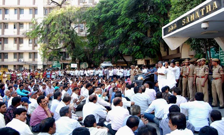 Secretariat staff protest in front of the C Block of the state Secretariat demanding their salaries for the month of February in Hyderabad on Friday. INN Photos