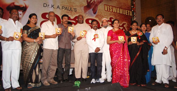 After a long hiatus controversial gospel preacher KA Paul made a public appearance at an audio release of a movie 'Viswavijeta' on Saturday in Hyderabad. Prominent among the invitees to the audio launch were Rajasekhar, Jeevita, CPI Narayana, PRP leader Sobha Rani, TDP leader Lal Jan Pasha, Peddi Reddy, Smt. Kavita and others. The movie is presented by KA Paul.