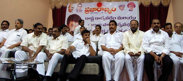 Praja Rajyam Party president K Chiranjeevi addresses party members at a State Committee and Party General Body, Joint State-Level meeting held at Vasanth Vihar Kalyanamantapam, Nagole, LB Nagar in Hyderabad on Monday. INN Photos