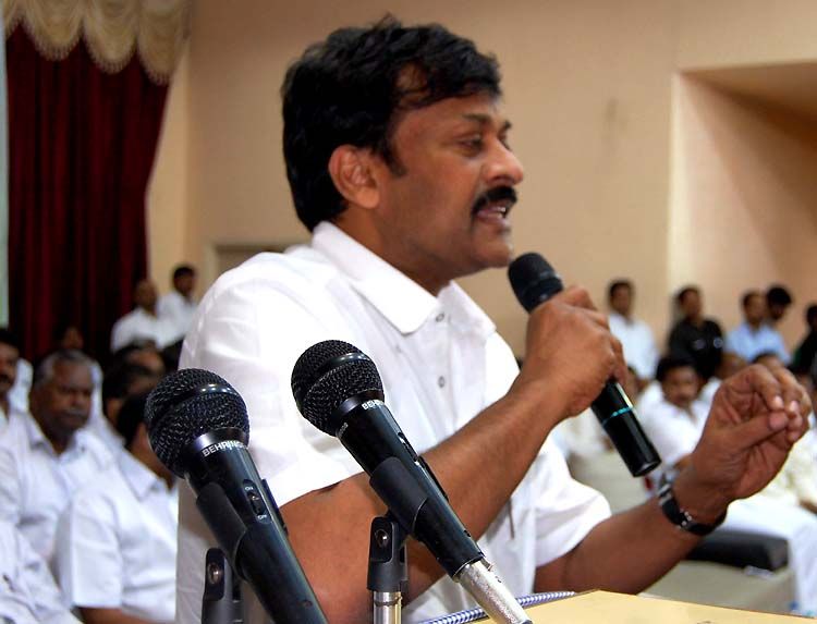 Praja Rajyam Party president K Chiranjeevi addresses party members at a State Committee and Party General Body, Joint State-Level meeting held at Vasanth Vihar Kalyanamantapam, Nagole, LB Nagar in Hyderabad on Monday. INN Photos