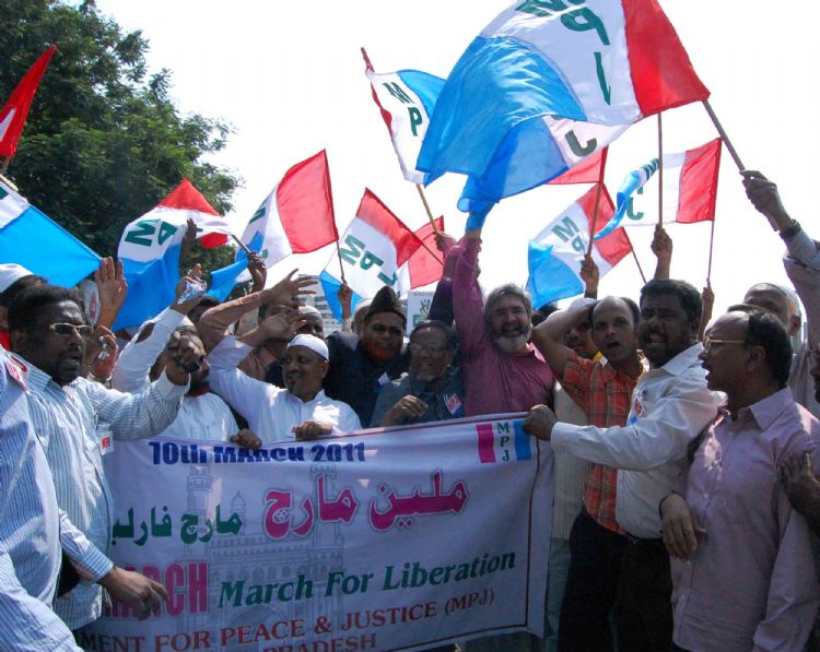 In a major show of strength, thousands of people violated ban orders and removed police barricades to assemble at Tank Bund area here on Thursday as part of the 'million march' for a separate Telangana state. The peaceful protest during the day was marred by incidents of violence in the evening. Protesters damaged some statues of Telugu leaders on Tank Bund, set afire a police vehicle and attacked a vehicle and crew of a television channel. -INN Photos