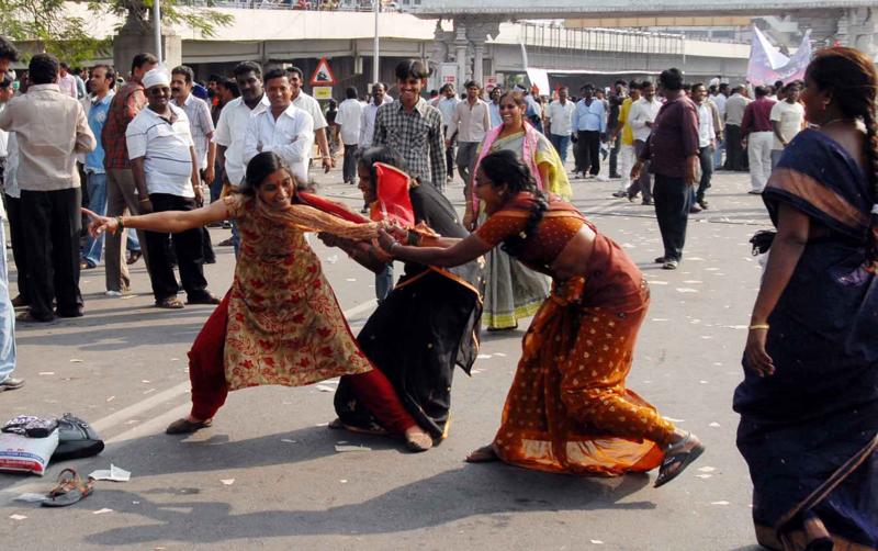 Telangana activists destroy the statues of famous Telugu personalities on Tank Bund after they went berserk during the Million Marchin Hyderabad on Thursday. They set on fire OB van of a news channel, police vehicle on Tankbund. INN Photos