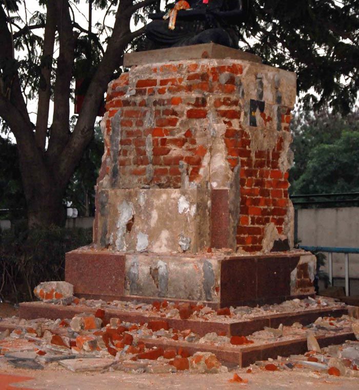Telangana activists destroy the statues of famous Telugu personalities on Tank Bund after they went berserk during the Million Marchin Hyderabad on Thursday. They set on fire OB van of a news channel, police vehicle on Tankbund. INN Photos