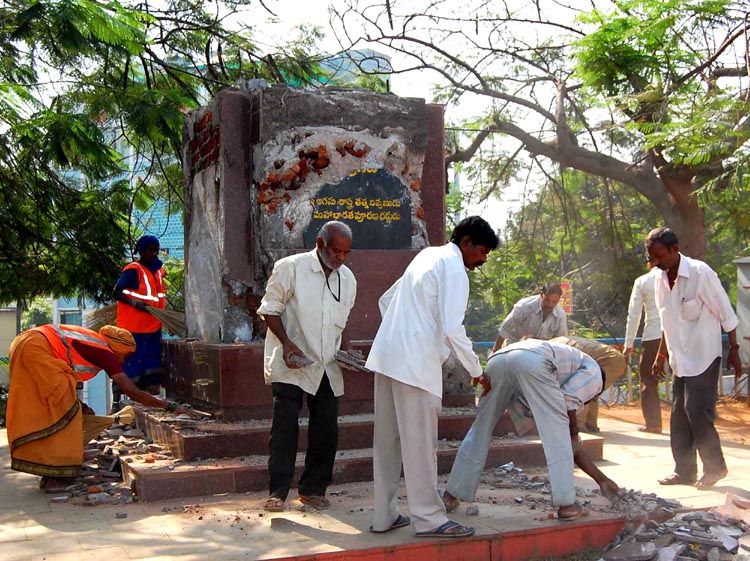 Workers remove debris of the statues of eminent Telugu personalities in Hyderabad on Friday. The statues were damaged by the pro-Telangana agitators on Thursday during the Million March. INN Photos