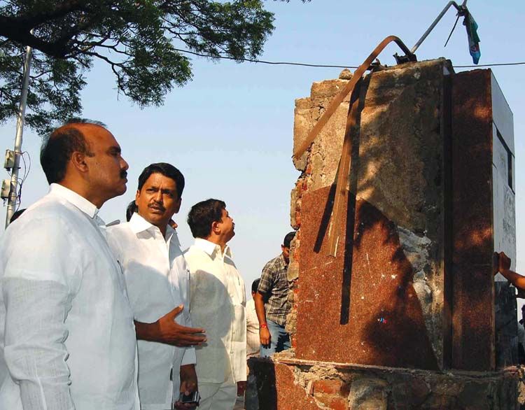 TDP Legislators from Seemandhra regions visit the Tank Bund in Hyderabad on Friday, where the statues of eminent Telugu personalities were desecrated and damaged by pro-Telangana agitators on Thursday during the Million March. INN Photos