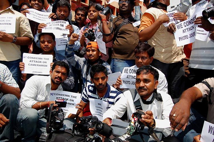 Journalists under the banner of the Andhra Pradesh Union of Working Journalists take out a rally from Basheer Bagh Press Club in Hyderabad on Friday, to protest against the attack on scribes during the Million March at the Tank Bund on Thursday. INN Photos