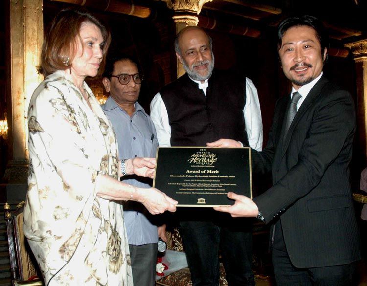 Princess Esra receives the UNESCO Asia Pacific Merit award for cultural heritage conservation on behalf of the Chowmohalla Palace from UNESCO representative Takahiko Makino at the Palace lawns in Hyderabad on Tuesday. INN Photos