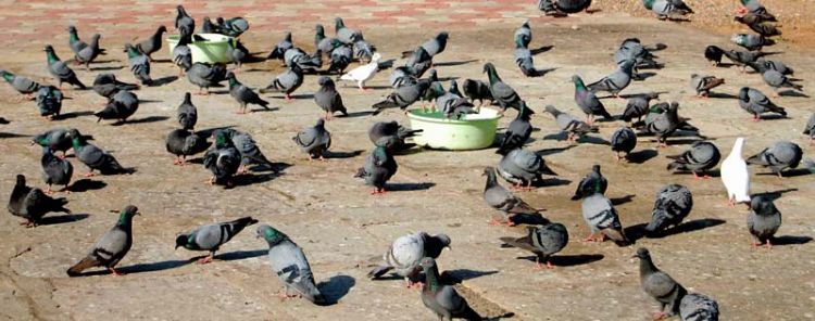 Pigeons enjoy a bathe from a tub as day temperatures rise considerably in Hyderabad on Wednesday. INN Photos